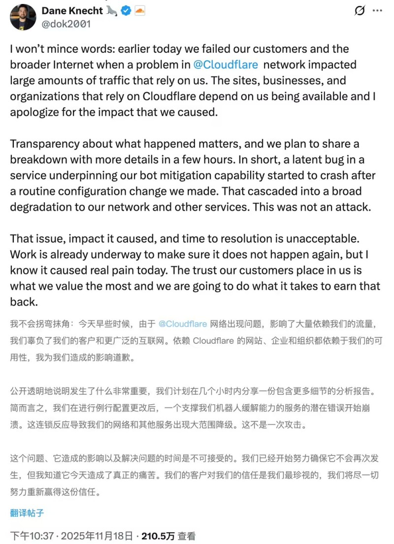 服务恢复后,Cloudflare CTO Dane Knecht 公开致歉说,此次事故“不可接受”,并指出一次例行配置调整触发了机器人防护层崩溃。