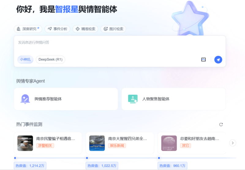传统的舆情监测系统仍困于数据碎片、响应滞后与操作复杂的泥潭之中。中科天玑“智报星舆情智能体”依托十六年大数据技术积累,集成三大核心智能体,提供全方位、多模态、深语义的舆情治理能力:
